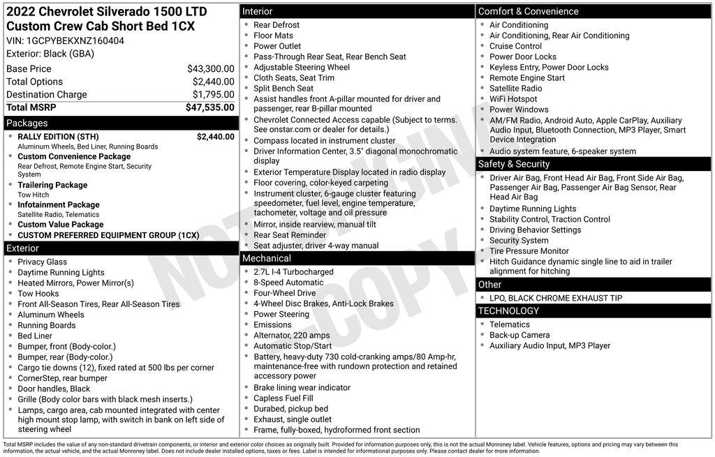 KEY FORD OF EXETER is proud to present you with another True Market Priced Pre-Owned Vehicle. Transparent Pricing Of $ 28999 !! This 2022 Chevrolet Silverado 1500 LTD Custom is loaded with the following Factory Options: Rally Edition (4" Black Round Assist Steps (LPO), Black Chrome Exhaust Tip (LPO), Chevytec Spray-On Black Bedliner, and Wheels: 20" x 9" High Gloss Black Painted Alum) Rally Edition (4" Black Round Assist Steps (LPO), Black Chrome Exhaust Tip (LPO), Chevytec Spray-On Black Bedliner, and Wheels: 20" x 9" High Gloss Black Painted Alum), Custom Convenience Package (Electric Rear-Window Defogger, EZ Lift Power Lock & Release Tailgate, LED Cargo Area Lighting, Remote Vehicle Starter System, and Theft Deterrent System (Unauthorized Entry)), Custom Value Package, Infotainment Package (Chevrolet Connected Access Capable, OnStar & Chevrolet Connected Services Capable, SiriusXM Radio, and Wi-Fi Hot Spot Capable), Preferred Equipment Group 1CX (3.5" Monochromatic Display Driver Info Center, Bluetooth® For Phone, Body Color Grille, Color-Keyed Carpeting Floor Covering, Compass, Deep-Tinted Glass, Electronic Cruise Control, Front Frame-Mounted Black Recovery Hooks, Front Rubberized Vinyl Floor Mats, Manual Tilt Wheel Steering Column, Power Door Locks, Power Front Windows w/Driver Express Up/Down, Power Front Windows w/Passenger Express Down, Power Rear Windows w/Express Down, Rear 60/40 Folding Bench Seat (Folds Up), Rear Rubberized-Vinyl Floor Mats, Remote Keyless Entry, and Standard Tailgate), Trailering Package (Hitch Guidance), 3.42 Rear Axle Ratio, 4-Wheel Disc Brakes, 40/20/40 Front Split Bench Seat, 6 Speakers, 6-Speaker Audio System, ABS brakes, Air Conditioning, Alloy wheels, AM/FM radio: SiriusXM, Apple CarPlay/Android Auto, Brake assist, Bumpers: body-color, Cloth Seat Trim, Delay-off headlights, Driver door bin, Driver vanity mirror, Dual front impact airbags, Dual front side impact airbags, Electronic Stability Control, Front anti-roll bar, Front Center Armrest w/Storage, Front reading lights, Front wheel independent suspension, Fully automatic headlights, Heated door mirrors, Heavy Duty Suspension, Illuminated entry, Low tire pressure warning, Occupant sensing airbag, Outside temperature display, Overhead airbag, Overhead console, Panic alarm, Passenger door bin, Passenger vanity mirror, Power door mirrors, Power steering, Power windows, Premium audio system: Chevrolet Infotainment 3, Radio data system, Radio: Chevrolet Infotainment 3 System, Rear reading lights, Rear step bumper, Rear window defroster, Remote keyless entry, Security system, Speed control, Speed-sensing steering, Split folding rear seat, Tachometer, Tilt steering wheel, Traction control, Trip computer, Variably intermittent wipers, Voltmeter, and Wheels: 20" x 9" Bright Silver Painted Aluminum!!