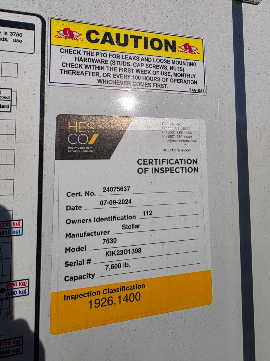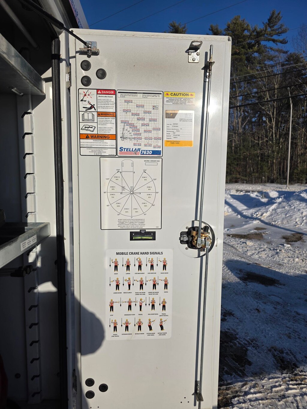 The crane is a stellar 7630 telescopic crane 44,840 foot pound rated 7500 LB maximum capacity 30 foot full hydraulic reach CDT pro equipped proportional radio remote control.