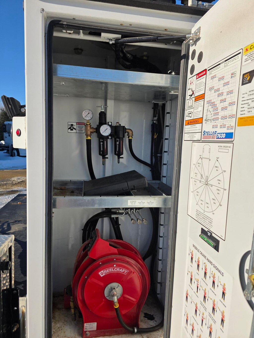 4th vertical open crane tower 2 adjustable shelves with dividers hose reel door rear facing