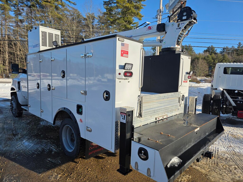 60 inch high by 22 inch deep compartments front first vertical subframe floor 52 inches wide by 134 inches long 10 gauge checker plate floor and ladder type subframe 49,000 foot pounds steel crane tower suitable for stellar crane model 7630 four 6000 LB swivel tie down rings in the floor bumper area hydraulic outriggers out and down on crane side and down only on other side HD steel workbench bumper 2 1/2 inch 16,000 LB receiver hitch 14 inch high ACP drop down tailgate two large stainless steel grab handles