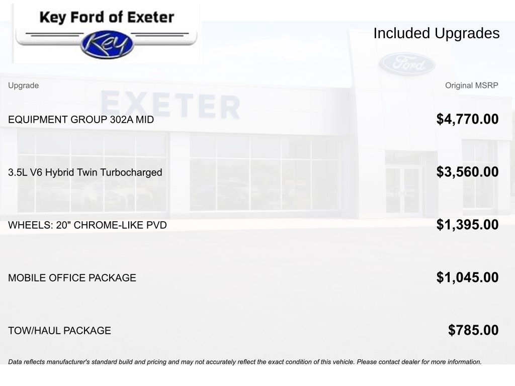 KEY FORD OF EXETER is proud to present you with another True Market Priced Pre-Owned Vehicle. Transparent Pricing Of $ 47999 !! This 2024 Ford F-150 XLT is loaded with the following Factory Options: 3.5L PowerBoost Full-Hybrid V6 and 4WD Equipment Group 302A Mid (Cloth 40/Console/40 Front Seats), Mobile Office Package (Console Worksurface and Partitioned Lockable Rear Storage), Tow/Haul Package (Integrated Trailer Brake Controller), 3.5L PowerBoost Full-Hybrid V6, 4WD, 4-Wheel Disc Brakes, 6 Speakers, ABS brakes, Air Conditioning, Alloy wheels, AM/FM radio: SiriusXM with 360L, Auto High-beam Headlights, Auto-dimming Rear-View mirror, Automatic temperature control, Brake assist, Bumpers: chrome, Chrome wheels, Cloth 40/20/40 Front Seat, Compass, Delay-off headlights, Driver door bin, Driver vanity mirror, Dual front impact airbags, Dual front side impact airbags, Electronic Stability Control, Emergency communication system: SYNC 4 911 Assist, Front anti-roll bar, Front Center Armrest w/Storage, Front dual zone A/C, Front fog lights, Front reading lights, Front wheel independent suspension, Fully automatic headlights, Heated door mirrors, Illuminated entry, LED Sideview Mirror Spotlights, Low tire pressure warning, Navigation system: Connected Navigation, Occupant sensing airbag, Outside temperature display, Overhead airbag, Overhead console, Panic alarm, Passenger door bin, Passenger vanity mirror, Power door mirrors, Power driver seat, Power steering, Power windows, Radio data system, Radio: AM/FM SiriusXM w/360L, Rear reading lights, Rear step bumper, Rear window defroster, Remote keyless entry, Security system, Speed control, Split folding rear seat, Steering wheel mounted audio controls, SYNC 4 w/Enhanced Voice Recognition, Tachometer, Telescoping steering wheel, Tilt steering wheel, Traction control, Trip computer, Variably intermittent wipers, Voltmeter, Wheels: 18" Chrome-Like PVD, and Wheels: 20" Chrome-Like PVD!!