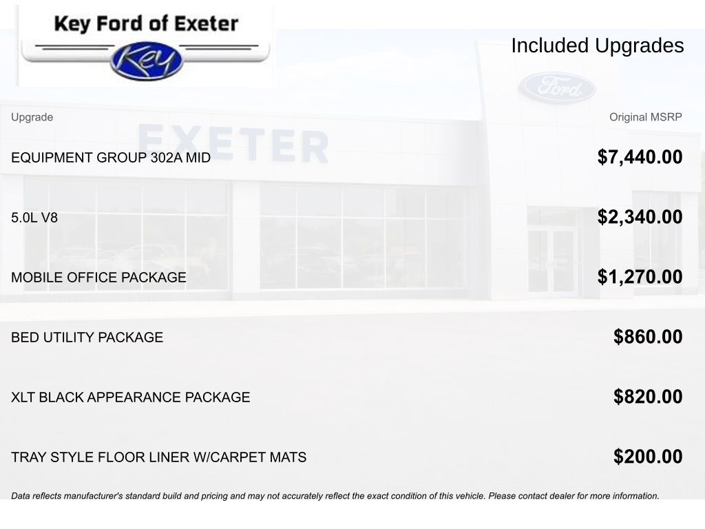 KEY FORD OF EXETER is proud to present you with another True Market Priced Pre-Owned Vehicle. Transparent Pricing Of $ 49299 !! This 2025 Ford F-150 XLT Ford Blue Advantage: Blue Certified is loaded with the following Factory Options: 4WD Bed Utility Package (4 Pickup Box Tie-Down Plates, LED Box Lighting, and Tailgate Step w/Tailgate Work Surface), Equipment Group 302A Mid (360 Degree Camera, 400W Cab & Bed Outlets, 6" Angular Bright Anodized Step Bar, Adaptive Cruise Control w/Stop & Go, Auto-Dimming Rear-View Mirror, Black Painted Grille w/Chrome Center Bar, Chrome Door & Tailgate Handles, Chrome Single-Tip Exhaust, Cloth 40/Console/40 Front Seats, Connected Navigation, Driver State Detection, Dual-Zone Electronic Automatic Temperature Control, Evasive Steering Assist, Ford Co-Pilot360 Assist 2.0, Front Parking Sensors, Heated Front Seats, Intelligent Access w/Push Button Start, Power Glass Heated Sideview Mirrors, Power-Sliding Rear Window, Remote Start System w/Remote Tailgate Release, Towing Technology, and Wrapped Steering Wheel), Mobile Office Package (Console Worksurface and Partitioned Lockable Rear Storage), Ford Blue Advantage: Blue Certified Certified, 4WD, 3.31 Axle Ratio, 4-Wheel Disc Brakes, 6 Speakers, ABS brakes, Air Conditioning, Alloy wheels, AM/FM radio: SiriusXM with 360L, Auto High-beam Headlights, Brake assist, Bumpers: chrome, Chrome wheels, Cloth 40/20/40 Front Seat, Compass, Delay-off headlights, Driver door bin, Driver vanity mirror, Dual front impact airbags, Dual front side impact airbags, Electronic Stability Control, Emergency communication system: SYNC 4 911 Assist, Front anti-roll bar, Front Center Armrest, Front fog lights, Front reading lights, Front wheel independent suspension, Fully automatic headlights, Heated door mirrors, Illuminated entry, Internet access capable: FordPass Connect 5G, Low tire pressure warning, Occupant sensing airbag, Outside temperature display, Overhead airbag, Overhead console, Panic alarm, Passenger door bin, Passenger vanity mirror, Power door mirrors, Power steering, Power windows, Radio data system, Radio: AM/FM Stereo w/SiriusXM 360L, Rear Parking Sensors, Rear reading lights, Rear step bumper, Rear window defroster, Remote keyless entry, Security system, Speed control, Split folding rear seat, Steering wheel mounted audio controls, SYNC 4 w/Enhanced Voice Recognition, Tachometer, Telescoping steering wheel, Tilt steering wheel, Traction control, Tray Style Floor Liner w/Carpet Mats, Trip computer, Variably intermittent wipers, Voltmeter, and Wheels: 18" Chrome-Like PVD!!