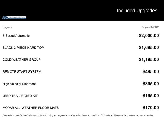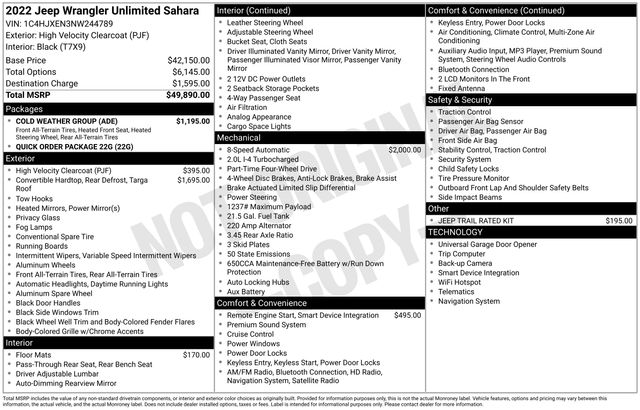 Key Chrysler Dodge Jeep Ram of White River is proud to present you with another True Market Priced Pre-Owned Vehicle. Transparent Pricing Of $ 26219 !! This 2022 Jeep Wrangler Unlimited Sahara is loaded with the following Factory Options: Cold Weather Group (Heated Front Seats and Heated Steering Wheel), Quick Order Package 22G, 110 MPH Vehicle Max Speed Calibration, 3.45 Rear Axle Ratio, 4-Wheel Disc Brakes, 9 Speakers, ABS brakes, Air Conditioning, Alloy wheels, AM/FM radio: SiriusXM, Apple CarPlay/Android Auto, Auto-dimming Rear-View mirror, Automatic temperature control, Aux Battery, Black 3-Piece Hard Top, Brake assist, Cloth Low-Back Bucket Seats, Compass, Delay-off headlights, Driver door bin, Driver vanity mirror, Dual front impact airbags, Dual front side impact airbags, Electronic Stability Control, Emergency communication system: SiriusXM Guardian, Engine Oil Cooler, Freedom Panel Storage Bag, Front anti-roll bar, Front Bucket Seats, Front Center Armrest w/Storage, Front dual zone A/C, Front fog lights, Front reading lights, Fully automatic headlights, Garage door transmitter, Heated door mirrors, Heavy Duty Suspension w/Gas Shocks, Illuminated entry, Integrated roll-over protection, Jeep Trail Rated Kit, Leather steering wheel, Low tire pressure warning, MOPAR All-Weather Floor Mats, Navigation System, No Soft Top, Non-Lock Fuel Cap w/o Discriminator, Occupant sensing airbag, Outside temperature display, Panic alarm, ParkView Rear Back-Up Camera, Passenger door bin, Passenger vanity mirror, Power door mirrors, Power steering, Power windows, Radio data system, Radio: Uconnect 4C Nav w/8.4" Display, Rear anti-roll bar, Rear reading lights, Rear Window Defroster, Rear Window Wiper/Washer, Remote keyless entry, Remote Start System, Security system, Speed control, Split folding rear seat, Steering wheel mounted audio controls, Stop-Start Dual Battery System, Tachometer, Telescoping steering wheel, Tilt steering wheel, Traction control, Trip computer, Variably intermittent wipers, Voltmeter, and Wheels: 18" x 7.5" Polished w/Gray Spokes!!