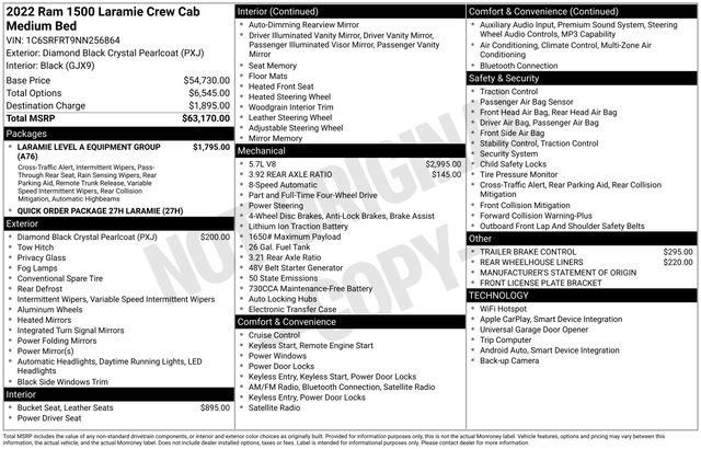 2022 Ram 1500 Laramie Diamond Black Crystal Pearlcoat Laramie 4D Crew Cab HEMI 5.7L V8 Multi Displacement VVT 8-Speed Automatic 4WD