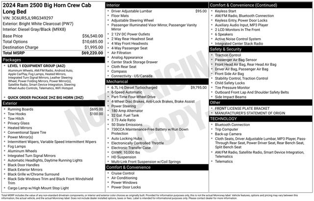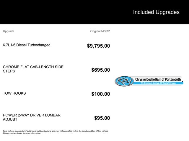 Key Chrysler Dodge Ram of Portsmouth is proud to present you with another True Market Priced Pre-Owned Vehicle. Transparent Pricing Of $ 44458 !! This 2024 Ram 2500 Big Horn is loaded with the following Factory Options: Level 1 Equipment Group (2 Way Rear Headrest Seat, 2nd Row In Floor Storage Bins, 4 Way Front Headrests, 40/20/40 Split Bench Seat, 4G LTE Wi-Fi Hot Spot, 8.4" Touchscreen Display, Apple CarPlay, Auto Power-Folding Mirrors, Big Horn IP Badge, Black Exterior Mirrors, Bluetooth Handsfree Phone & Audio, Center Hub, Connectivity - US/Canada, Dual Glove Boxes, Exterior Mirrors Courtesy Lamps, Exterior Mirrors w/Heating Element, Exterior Mirrors w/Supplemental Signals, Foam Bottle Insert (Door Trim Panel), Footwell Courtesy Lamp, For Details, Visit DriveUconnect.com, For More Info, Call 800-643-2112, Forward & Reverse Utility Lights, Front Armrest w/Cupholders, Front Center Seat Cushion Storage, Front Fog Lamps, Front Seat Back Map Pockets, Global Telematics Box Module (TBM), Glove Box Lamp, Google Android Auto, GPS Antenna Input, Integrated Center Stack Radio, Integrated Voice Command w/Bluetooth, Leather Wrapped Steering Wheel, Locking Lower Glove Box, Manual Adjust 4-Way Front Passenger Seat, Mirror Running Lights, Power 2-Way Driver Lumbar Adjust, Power Adjust 8-Way Driver Seat, Power Adjust Mirrors, Power Adjustable Convex Aux Mirrors, Power Heated Fold Telescope Mirrors, Power Telescoping Mirrors, Rear 60/40 Folding Seat, Rear Dome w/On/Off Switch Lamp, Remote USB Port - Charge Only, Selectable Tire Fill Alert, SiriusXM Radio Service, SiriusXM Satellite Radio, Steering Wheel Mounted Audio Controls, Storage Tray, and Wheels: 18" x 8.0" Polished Aluminum), Quick Order Package 2HZ Big Horn, 3.73 Axle Ratio, 4-Wheel Disc Brakes, 6 Speakers, ABS brakes, Active Noise Control System, Air Conditioning, Brake assist, Bumpers: chrome, Center Stack Storage Drawer, Chrome Flat Cab-Length Side Steps, Cloth 40/20/40 Bench Seat, Compass, Delay-off headlights, Driver door bin, Dual front impact airbags, Dual front side impact airbags, Electronic Stability Control, Electronically Controlled Throttle, Emergency communication system: SiriusXM Guardian, Front anti-roll bar, Front Center Armrest w/Storage, Front License Plate Bracket, Front reading lights, Fully automatic headlights, Heated door mirrors, Illuminated entry, Low tire pressure warning, Manual Adjust 4-Way Driver Seat, Manufacturer's Statement of Origin, Occupant sensing airbag, Outside temperature display, Overhead airbag, Overhead console, Panic alarm, ParkView Rear Back-Up Camera, Passenger door bin, Passenger vanity mirror, Power door mirrors, Power steering, Power windows, Premium Cloth 40/20/40 Bench Seat (DISC), Radio data system, Radio: Uconnect 3 w/5" Display, Radio: Uconnect 5 W w/8.4" Display, Rear anti-roll bar, Rear Folding