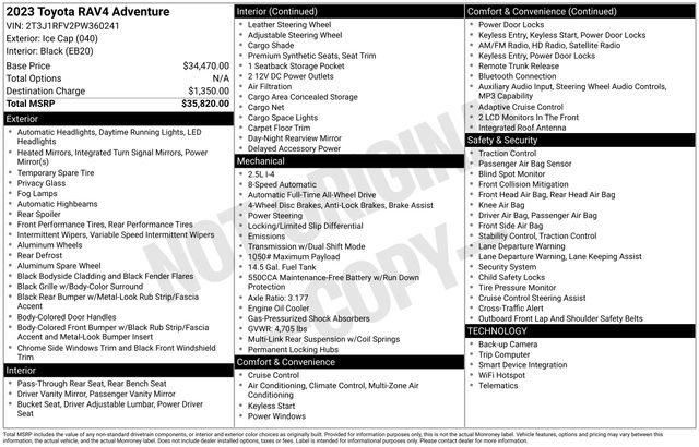 Key Chrysler Dodge Jeep Ram of Rochester is proud to present you with another True Market Priced Pre-Owned Vehicle. Transparent Pricing Of $ 30877 !! This 2023 Toyota RAV4 Adventure is loaded with the following Factory Options: AWD and Black Premium Synthetic AWD, Black Premium Synthetic, 19" Split 5-Spoke Alloy Wheels, 4-Wheel Disc Brakes, 6 Speakers, ABS brakes, Air Conditioning, Alloy wheels, AM/FM radio: SiriusXM, Auto High-beam Headlights, Automatic temperature control, Axle Ratio: 3.177, Brake assist, Bumpers: body-color, Delay-off headlights, Driver door bin, Driver vanity mirror, Dual front impact airbags, Dual front side impact airbags, Electronic Stability Control, Emergency communication system: Safety Connect (10-year trial), Exterior Parking Camera Rear, Four wheel independent suspension, Front anti-roll bar, Front Bucket Seats, Front Center Armrest, Front dual zone A/C, Front fog lights, Front reading lights, Fully automatic headlights, Heated door mirrors, Illuminated entry, Knee airbag, Leather Shift Knob, Low tire pressure warning, Occupant sensing airbag, Outside temperature display, Overhead airbag, Overhead console, Panic alarm, Passenger door bin, Passenger vanity mirror, Power door mirrors, Power driver seat, Power steering, Power windows, Radio data system, Radio: AM/FM/XM Audio System, Rear anti-roll bar, Rear seat center armrest, Rear window defroster, Rear window wiper, Remote keyless entry, Security system, SofTex Seat Trim, Speed control, Speed-sensing steering, Split folding rear seat, Spoiler, Steering wheel mounted audio controls, Tachometer, Telescoping steering wheel, Tilt steering wheel, Traction control, Trip computer, Turn signal indicator mirrors, and Variably intermittent wipers!!